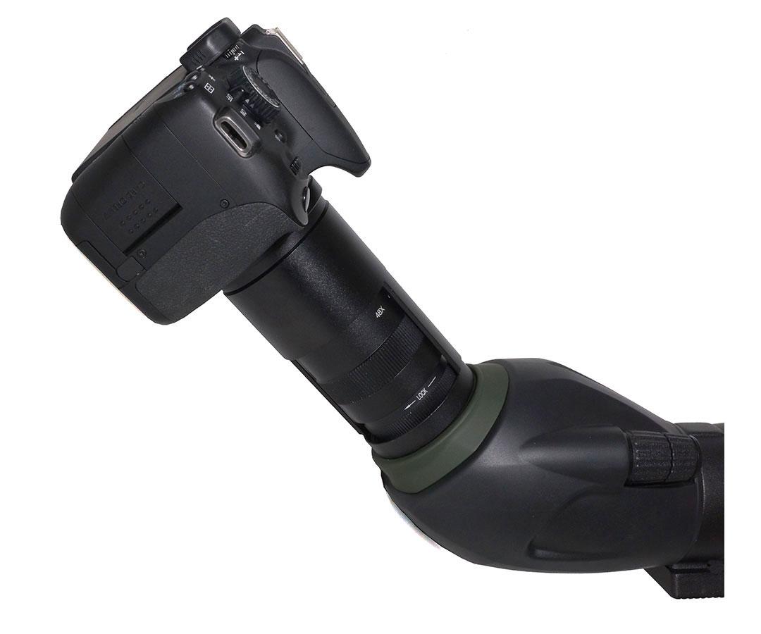 Adaptador para digiscoping – fotografía a través de catalejos TS. El adaptador permite conectar cámaras DSLR (mediante anillos en T) y cámaras digitales.