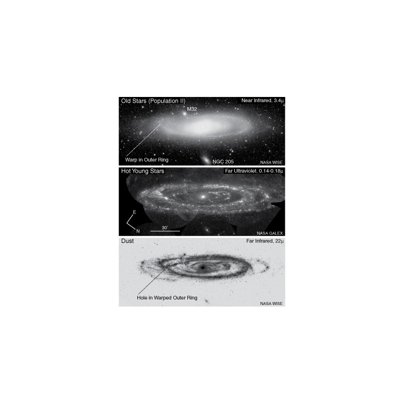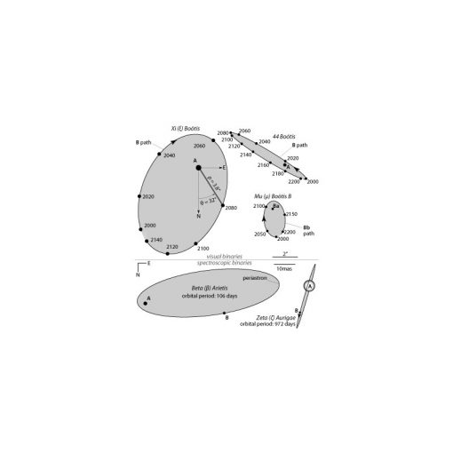 • Innovative diagrams created by retired NASA engineer Dennis Webb, in turn, augment the text. Virtually all of them display multiple layers of scientific information in a neat, uncluttered format. For instance, the binary star illustrations depict not only the locations of the components but also how they orbit one another and travel through the sky in three dimensions. Every object with intriguing structure is accompanied by one or more intuitive illustrations that show detail, often at several scales, in many cases from large terrestrial and orbiting observatories. “In some cases, we ‘deconstruct’ galaxies and nebulae,” says Webb, “with images at different wavelengths, revealing the elements of structure, so important to making sense of these distant mysteries. Illustrations or images images often accompany these deconstructions, relating what the amateur can observe to the latest discoveries, encouraging all amateurs to try to push past conventional limits on observing.”