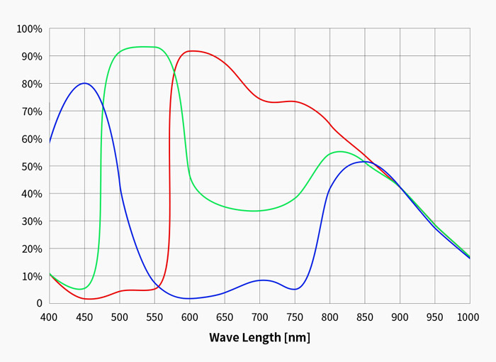 Eficiencia cuántica equivalente del sensor de cámara en color ASI585MC en función de la longitud de onda