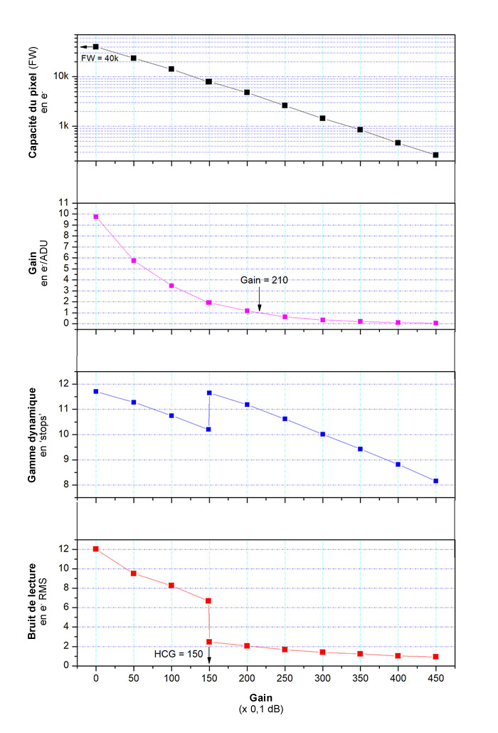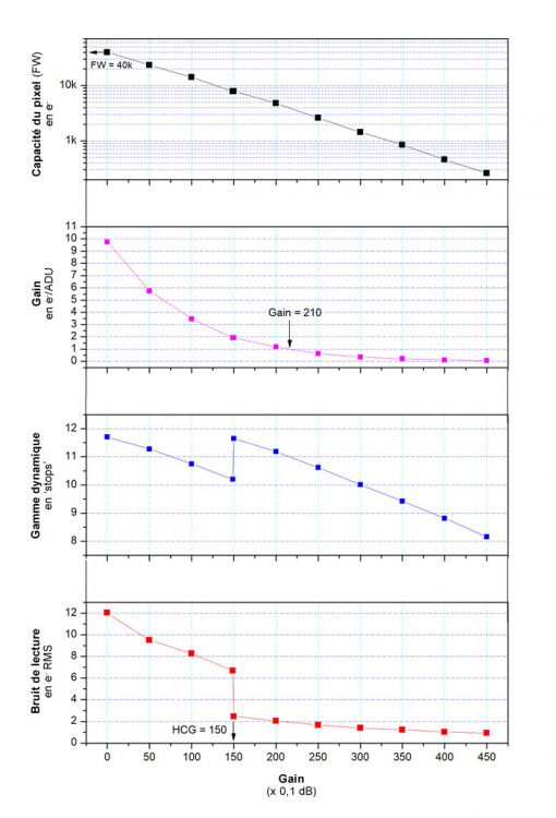 La cámara incorpora un dispositivo de alta ganancia de conversión (HCG) que puede reducir el ruido de reproducción con una ganancia alta y al mismo tiempo mantener el gran rango dinámico que se obtendría con una ganancia baja. Este modo HCG se activa automáticamente tan pronto como la ganancia alcanza 150. El ruido de reproducción cae a 2 e- mientras que el rango dinámico aumenta a 12 paradas.