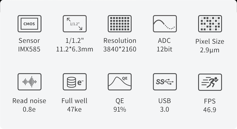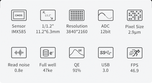 Diseñado por Sony para aplicaciones de vigilancia y seguridad, el sensor IMX585 está construido sobre la arquitectura STARVIS 2. Este último integra potentes funciones que permiten obtener imágenes brillantes y contrastadas, con una dinámica significativa, incluso en condiciones de iluminación extremadamente limitadas. La tecnología principal consiste en la iluminación desde detrás de los fotositos; el sensor se llama «retroiluminado» (o BSI, sensor de iluminación trasera). Esta técnica reduce la distancia que debe recorrer la luz hacia el sensor y reduce el bloqueo de fotones por elementos electrónicos no fotosensibles. La sensibilidad aumenta considerablemente, incluso en condiciones de muy poca luz. El sensor también es extremadamente eficaz en el infrarrojo cercano (NIR), una banda espectral apreciada por los astrofotógrafos planetarios por su menor sensibilidad a la turbulencia atmosférica.