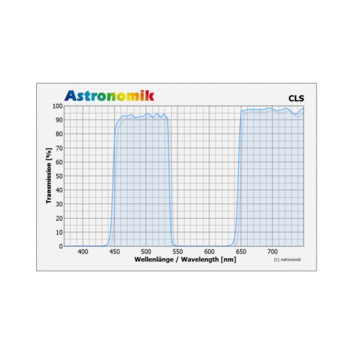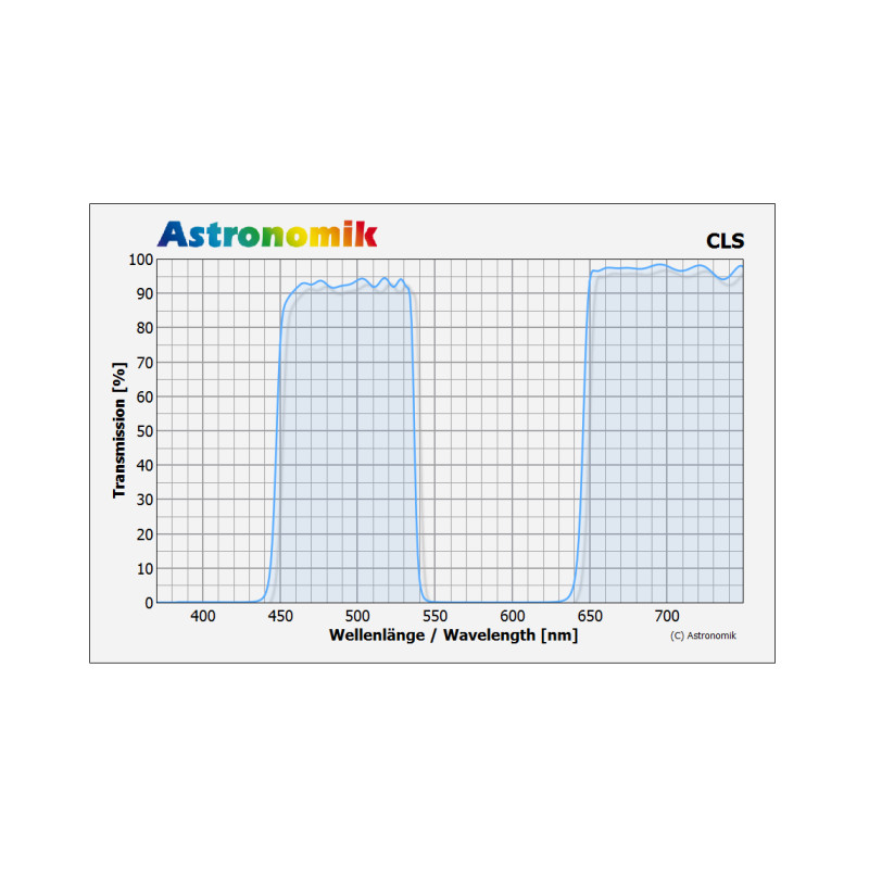 - el primer filtro que recomendamos es el Astronomik CLS. Este filtro suprime considerablemente la contaminación por luz artificial y el efecto airglow de luminiscencia nocturna natural. Con este filtro disfrutará de un fondo celeste oscuro que le permitirá hacer exposiciones mucho más largas y así ver los objetos más tenues. Está optimizado para mostrar los objetos con sus colores naturales. Importante: el filtro CLS sencillo no está dotado de bloqueo de la luz infrarroja. Por eso, si usa una cámara astromodificada necesitará el filtro CLS-CCD.