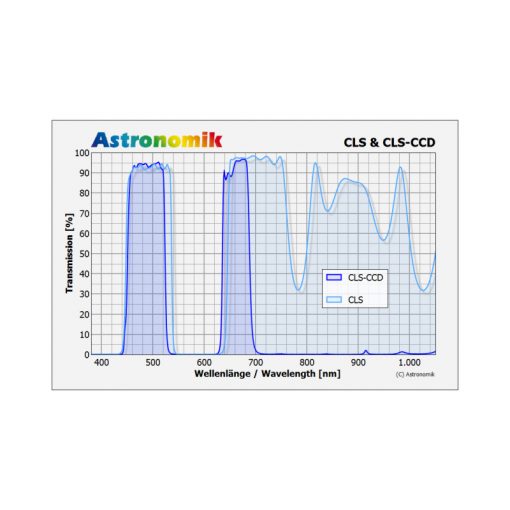 • el primer filtro que recomendamos es el Astronomik CLS. Este filtro suprime considerablemente la contaminación por luz artificial y el efecto airglow de luminiscencia nocturna natural. Con este filtro disfrutará de un fondo celeste oscuro que le permitirá hacer exposiciones mucho más largas y así ver los objetos más tenues. Está optimizado para mostrar los objetos con sus colores naturales. Importante: el filtro CLS sencillo no está dotado de bloqueo de la luz infrarroja. Por eso, si usa una cámara astromodificada necesitará el filtro CLS-CCD.