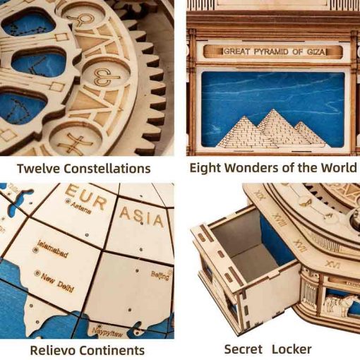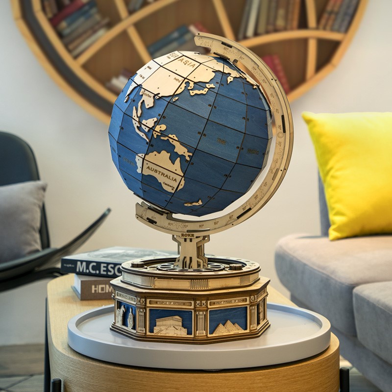 Globo terráqueo creado por Robotime con un estilo único que alberca sorpresas en su interior. Este globo de Robotime alberga en su base varios cajones donde podrás guardar lo que quieras. Además tiene un cajón secreto bloqueado por una clave donde podrás guardar tus objetos más valiosos. Este creativo puzzle de madera en 3D diseñado para adultos y adolescentes que resultará una decoración inspiradora que te llevará a viajar por todo el mundo desde casa. Un kit DIY con un trabajado diseño, perfecto para desarrollar tus habilidades. Utiliza un corte de precisión por láser sobre madera contrachapada de alta calidad.