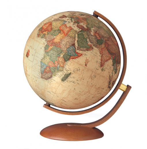 Globo geográfico iluminado con mapa al estilo antiguo e información actualizada. Base y meridiano de madera al estilo moderno.