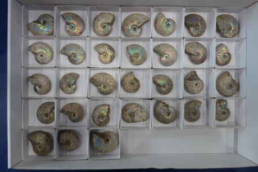 Lote Ammonite iridiscente de madagascar, 28 unidades en cajita 5×5 cm.