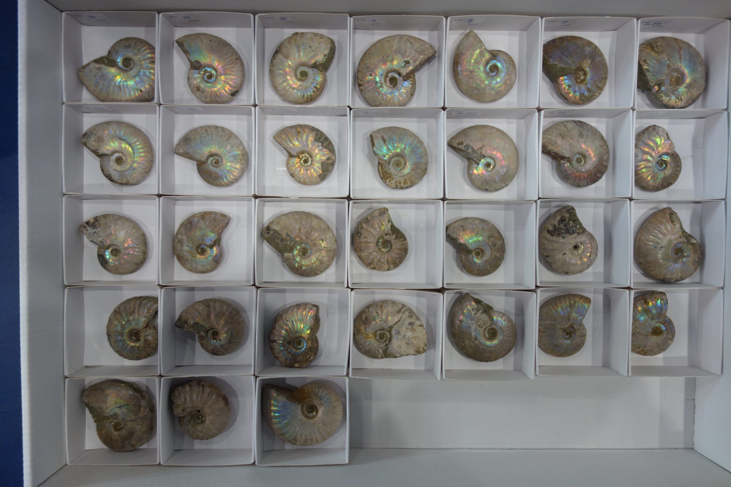 Lote Ammonite iridiscente 28 unidades en cajita 5×5 cm