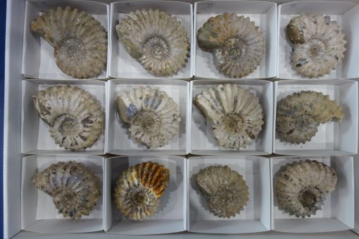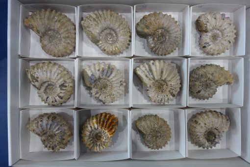 Lote fósiles Ammonite Douvilleiceras 11 unidades en cajita 9×8 cm