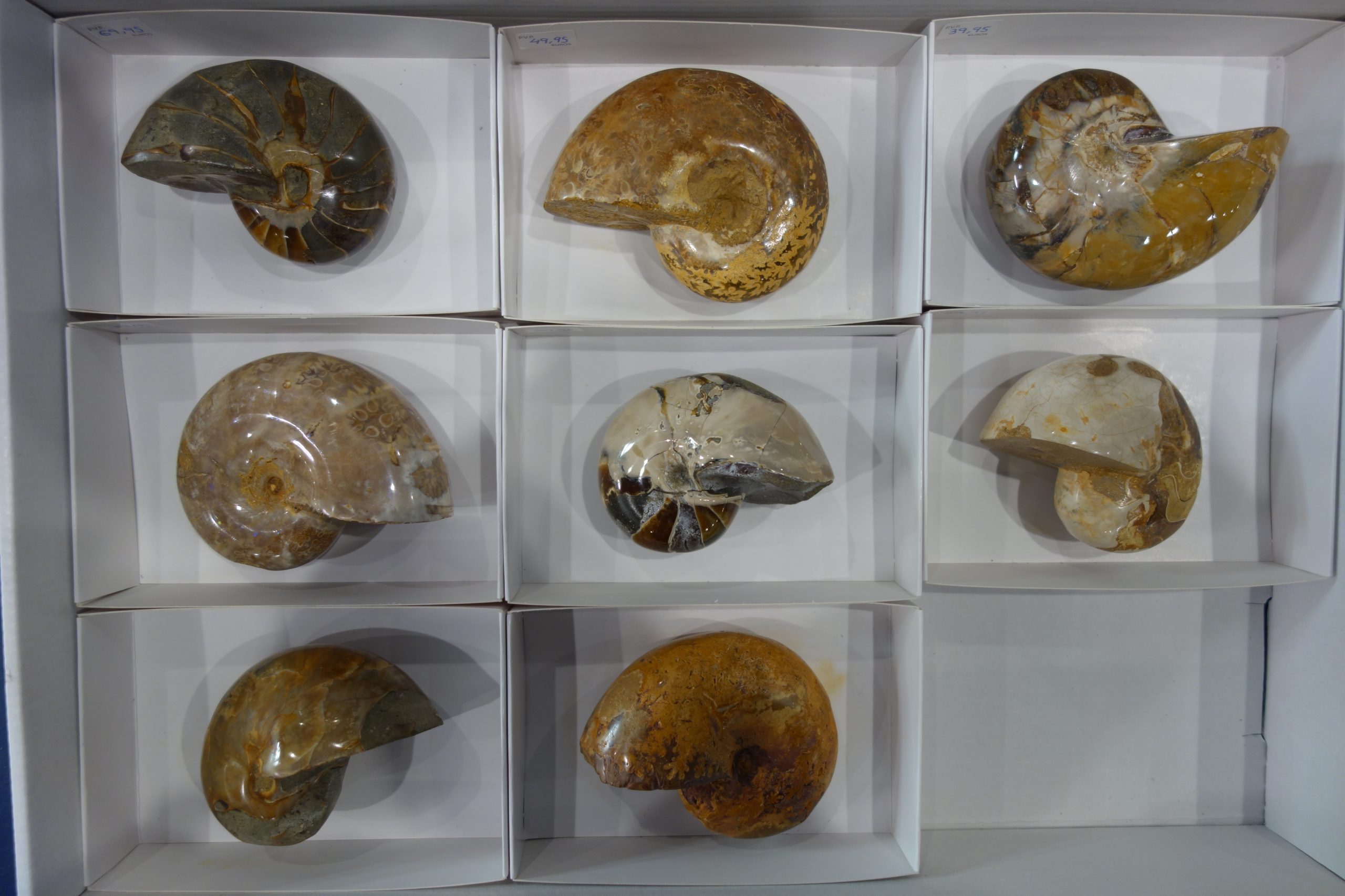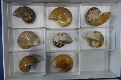 Lote fósiles Ammonite Nautilus 8 unidades en cajita 12,5×8 cm