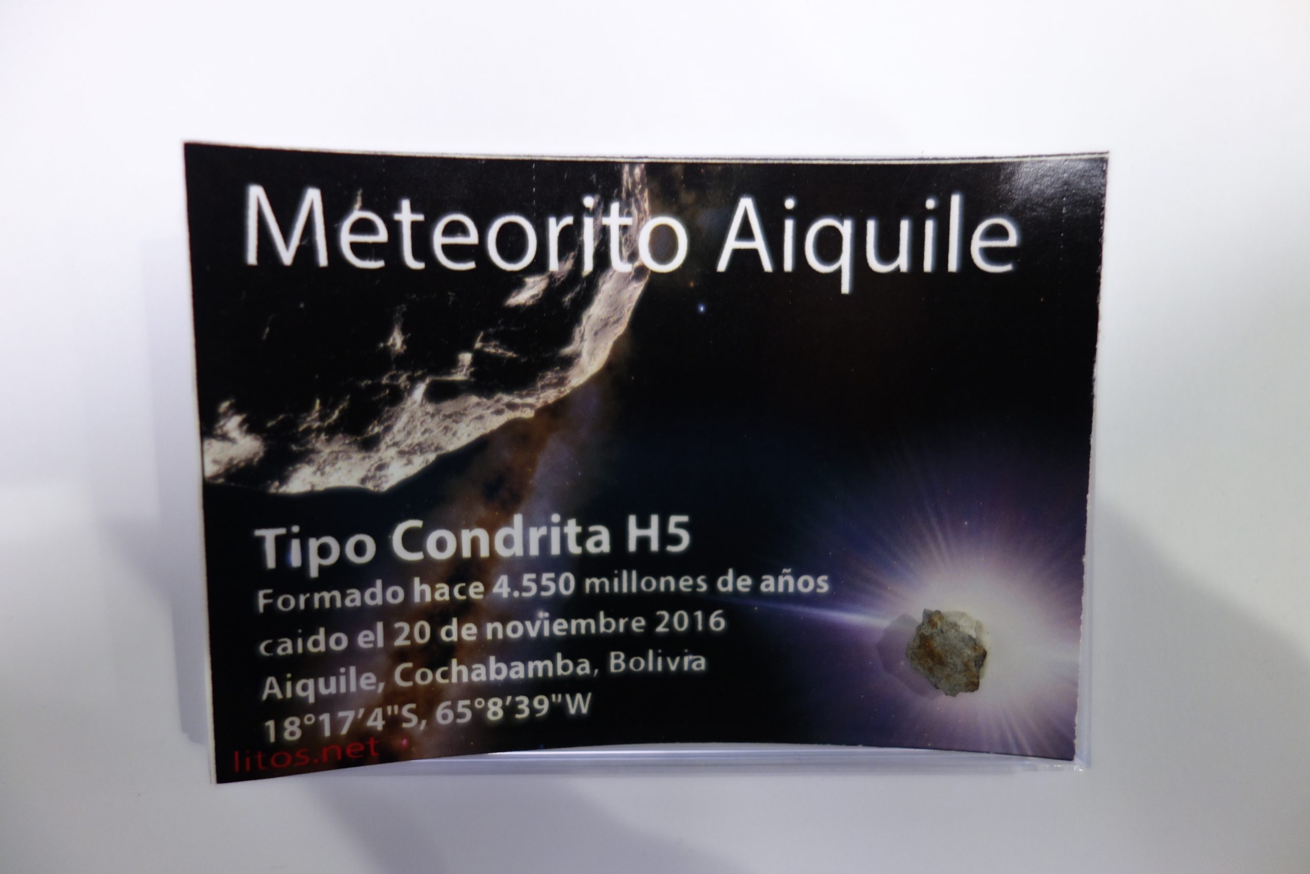 La caja mide 8,4 cm (largo) x 5,9 cm (ancho) x 1,3 cm (alto). Caja de plástico con tarjeta informativa del meteorito.