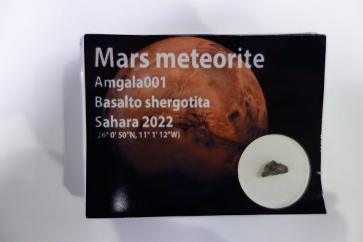 La caja mide 8,5 cm (largo) x 6,5 cm (ancho) x 2,5 cm (alto). Caja de plástico con tarjeta informativa del meteorito.