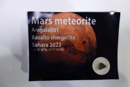 La caja mide 8,5 cm (largo) x 6,5 cm (ancho) x 2,5 cm (alto). Caja de plástico con tarjeta informativa del meteorito.