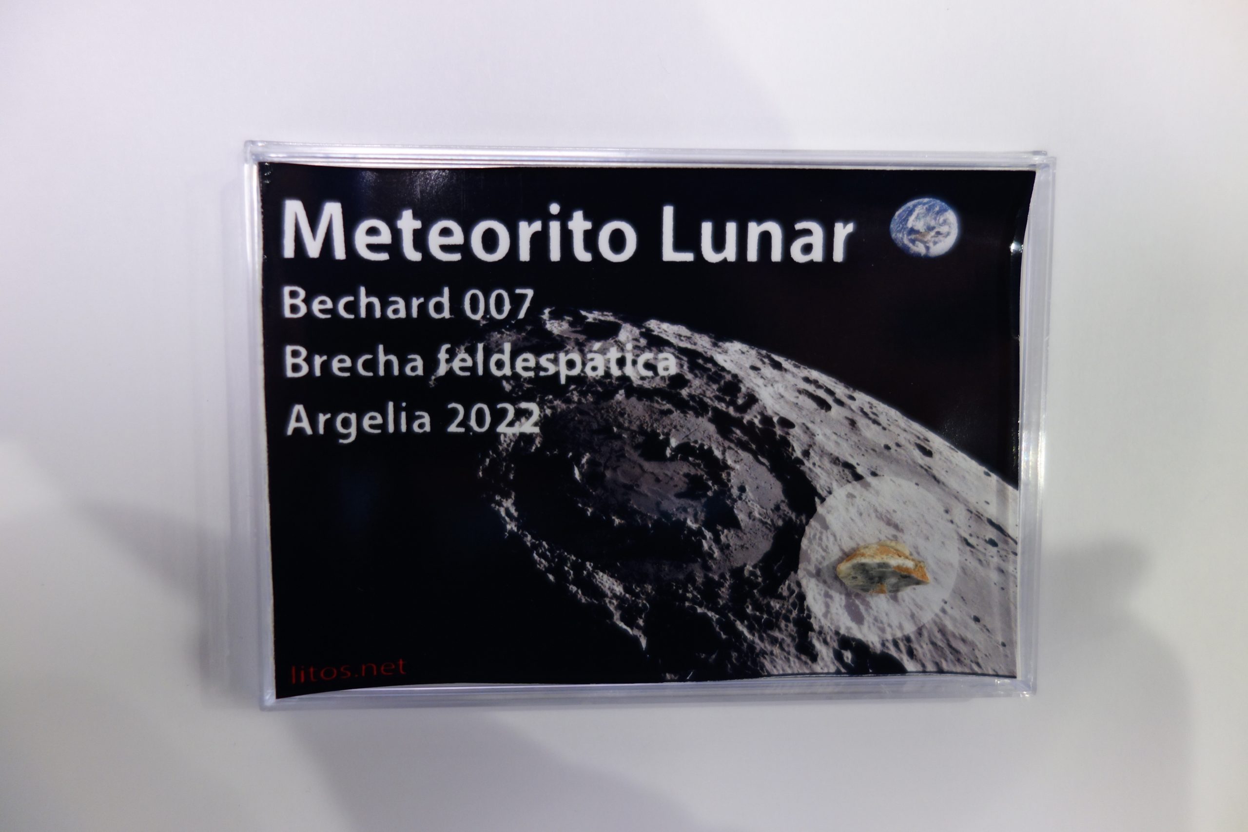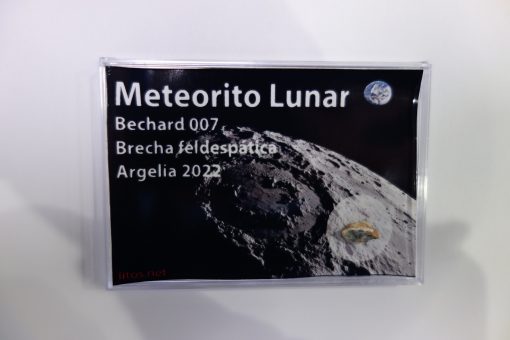 La caja mide 8,4 cm (largo) x 5,9 cm (ancho) x 1,3 cm (alto). Caja de plástico con tarjeta informativa del meteorito.