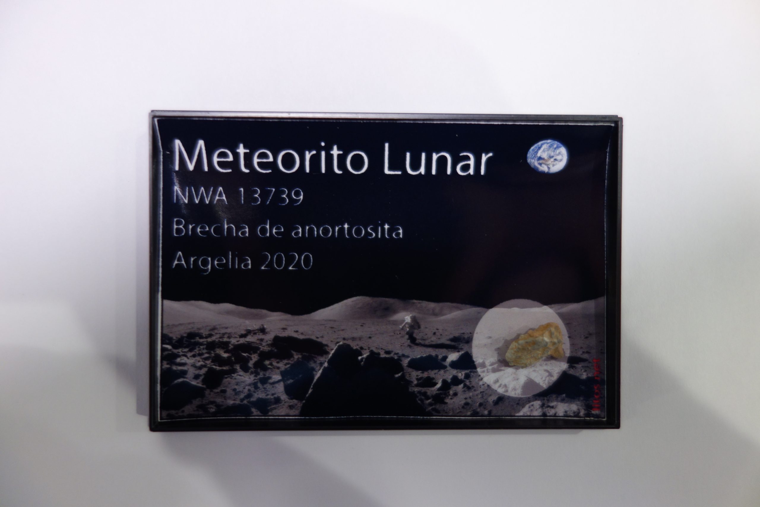 La caja mide 8,4 cm (largo) x 5,9 cm (ancho) x 1,3 cm (alto). Caja de plástico con tarjeta informativa del meteorito.