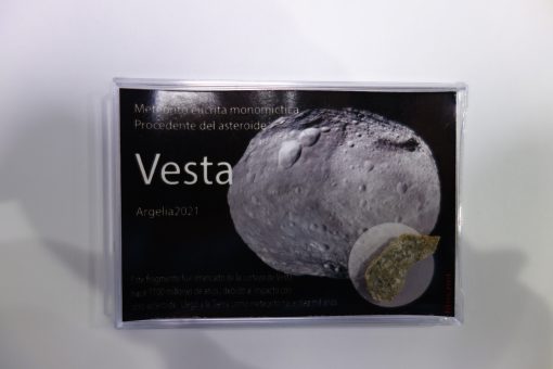 Meteorito eucrita monomíctica procedente del asteroide Vesta. Este fragmento fue arrancado de la corteza de Vesta hace 1100 millones de años, debido al impacto con otro asteroide. Llegó a la Tierra como meteorito hace diez mil años.