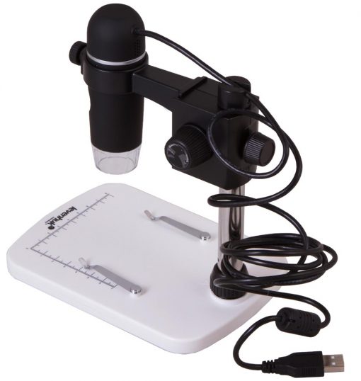 El moderno microscopio USB Levenhuk DTX 90 se utiliza en trabajos de alta precisión. El microscopio cuenta con una cámara de 5 Mpx y ofrece ampliaciones en el rango 10x – 300x. Cuenta con un trípode especial y una platina con escala medidora (8 cm en el eje x y 7 cm en el eje y) y dos pinzas para fijar la muestra bajo la cámara.