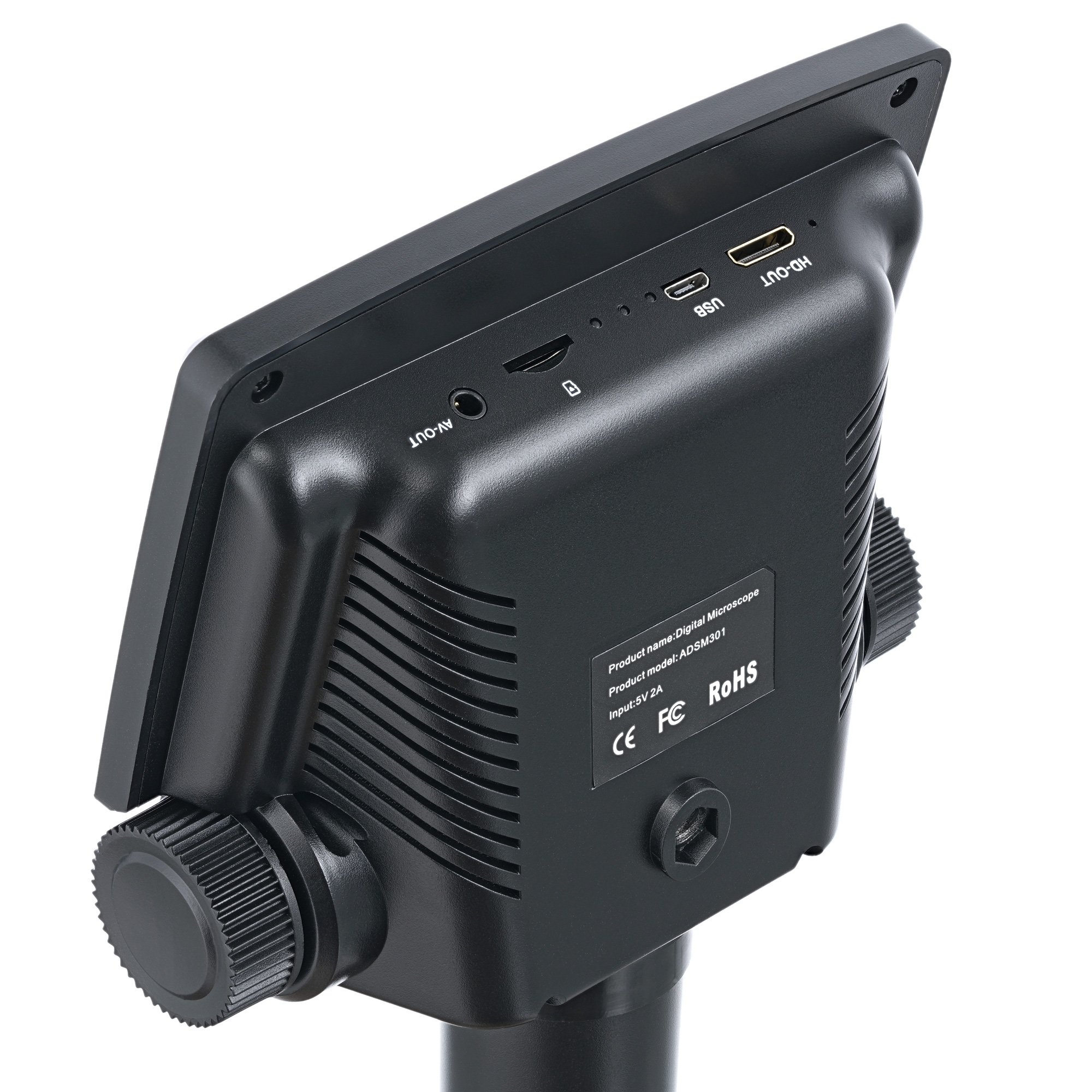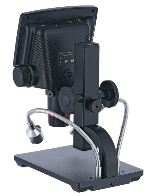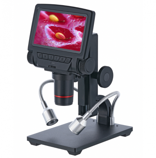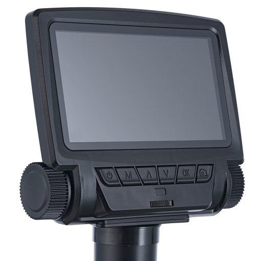 El microscopio proporciona una ampliación digital de 5 a 260 aumentos. La ampliación óptica varía desde 5 a 15 aumentos. La imagen transmitida por el objetivo se muestra en una pantalla LCD a color integrada de 5 pulgadas. La imagen es clara, de alto contraste y detallada. Se utilizan puertos HDMI y AV para la conexión con pantallas externas.