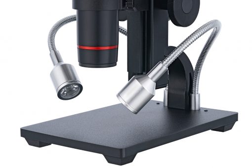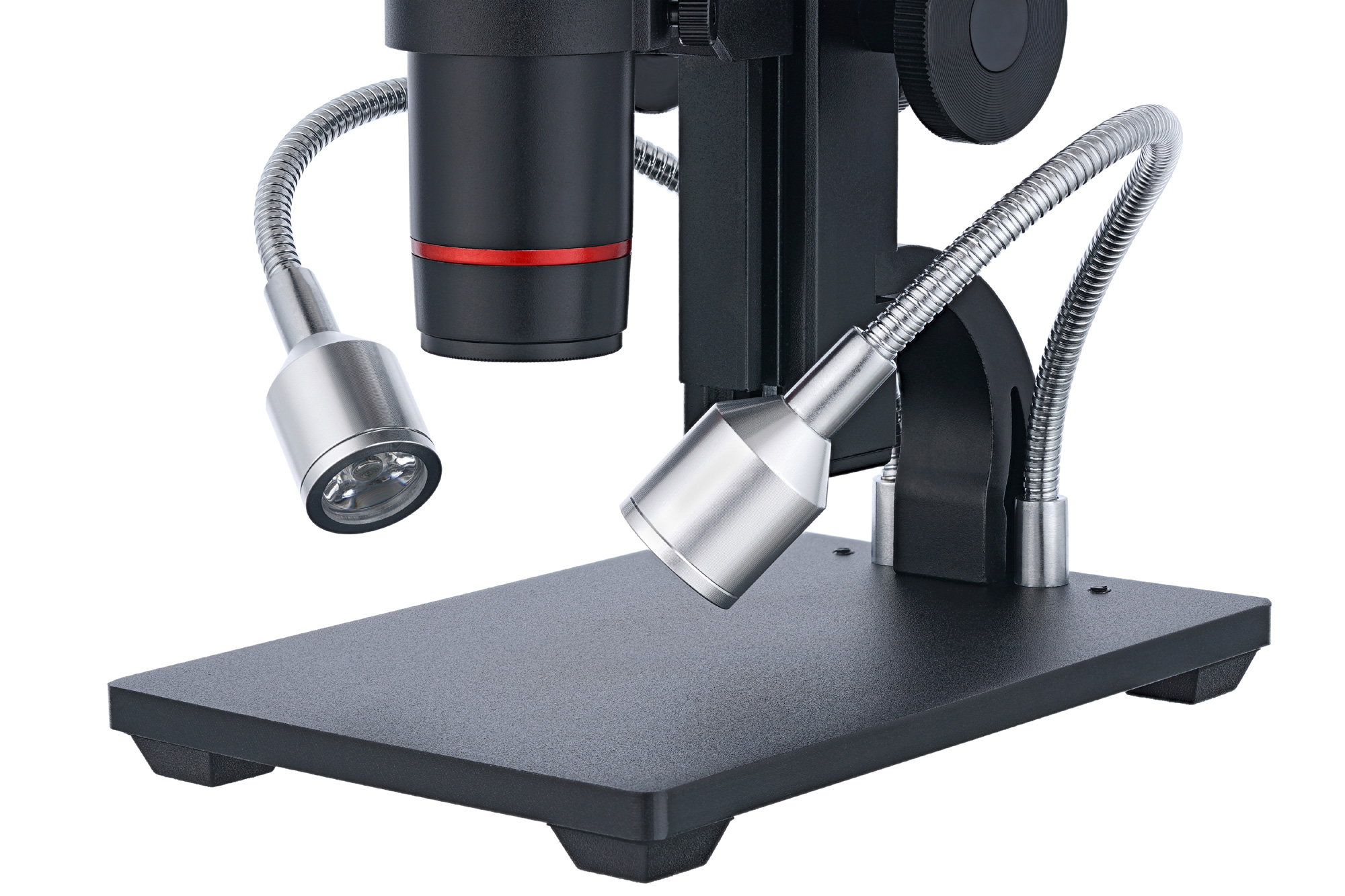 El sistema de iluminación se encuentra encima de la platina del microscopio y, por lo tanto, todas las observaciones se realizan con luz reflejada. Hay dos focos LED montados en soportes flexibles. Los soportes flexibles permiten inclinar los focos, creando así una iluminación más tridimensional y brillante. El brillo se puede ajustar con el mando situado en el cable de alimentación.