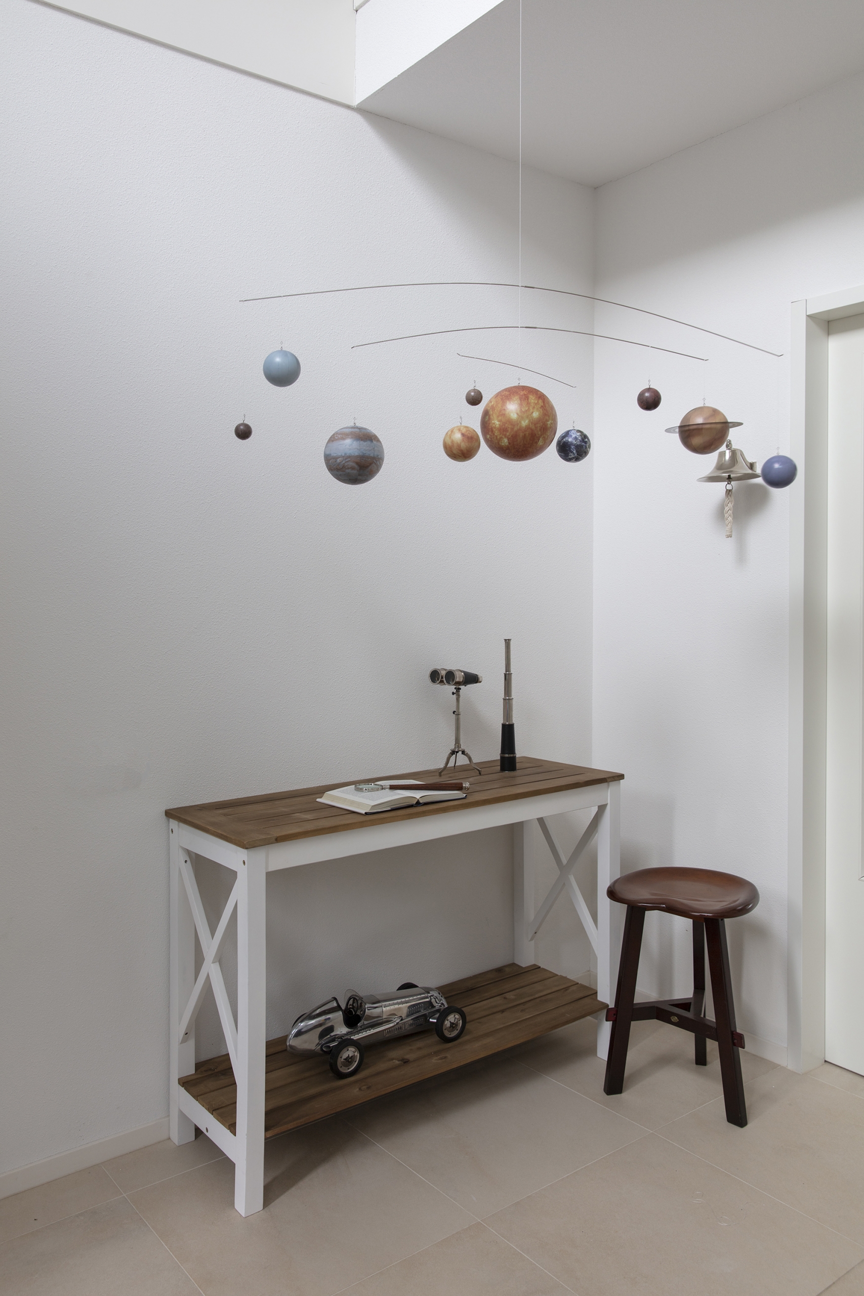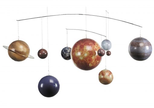 Materiales: globos en plástico duro, y la imagen de los planetas impresa en papel; varillas para colgar de metal. Los planetas ya vienen montados