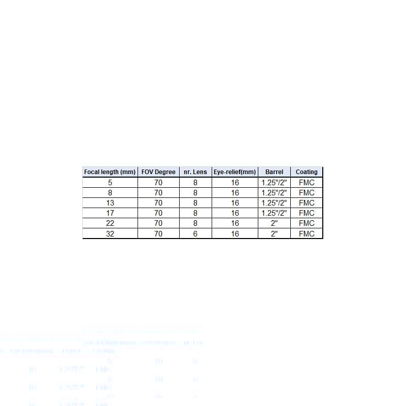 La serie Redline consta de oculares con 6 distancias focales diferentes: 32 mm, 22 mm, 17 mm, 13 mm, 8 mm, 5 mm y 3,5mm. Cubre un amplio rango de ampliaciones con una sola serie. La gran ventaja para el observador: Todos los modelos ofrecen imágenes de gran calidad.