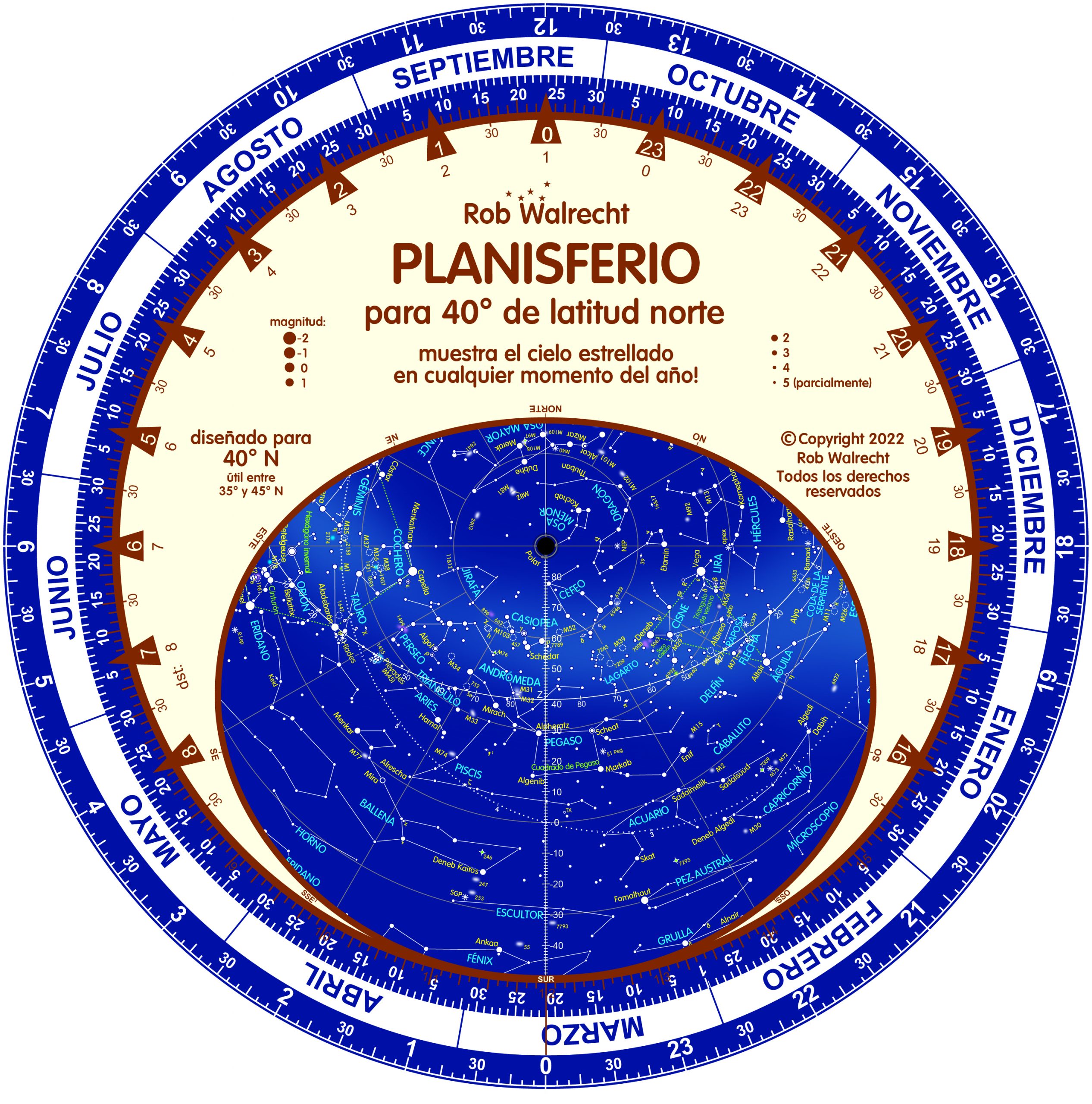 Planisferio para 40º latitud norte – Rob Walrecht (en español y en color)