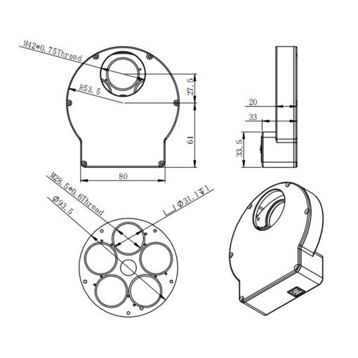 Esta rueda de filtros motorizada le permite colocar 5 filtros frente a su cámara y cambiarlos rápidamente usando una computadora (o la caja de control ASIAIR). El diseño muy delgado (20 mm de enfoque posterior) de esta rueda de filtros permite colocar los filtros lo más cerca posible del sensor, por lo que, si se usa con un ASI1600MM-Pro (con filtros de 31,75 mm), no se produce viñeteado con tubos en F/5 y más, al igual que con los filtros de 31 mm no montados, el tubo de imagen puede estar en F/2 y más.
