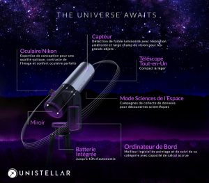 La tecnología digital y el desarrollo de aplicaciones para teléfonos inteligentes y tabletas han cambiado el mundo de la astronomía durante varios años. Unistellar, una start-up francesa, ha llevado esta filosofía más allá al hacer de su telescopio un concentrado de tecnologías patentadas sin precedentes. El eVscope (Telescopio de visión mejorada) es la culminación de 5 años de investigación y desarrollo lanzados por 4 franceses para permitir que todos: principiantes en astronomía o simplemente curiosos sobre el cielo, se embarquen en el descubrimiento del espacio y sus maravillas… sin tener cualquier conocimiento en este campo. Para aficionados o expertos, el eVscope representa una solución rápida para configurar además de su equipo.