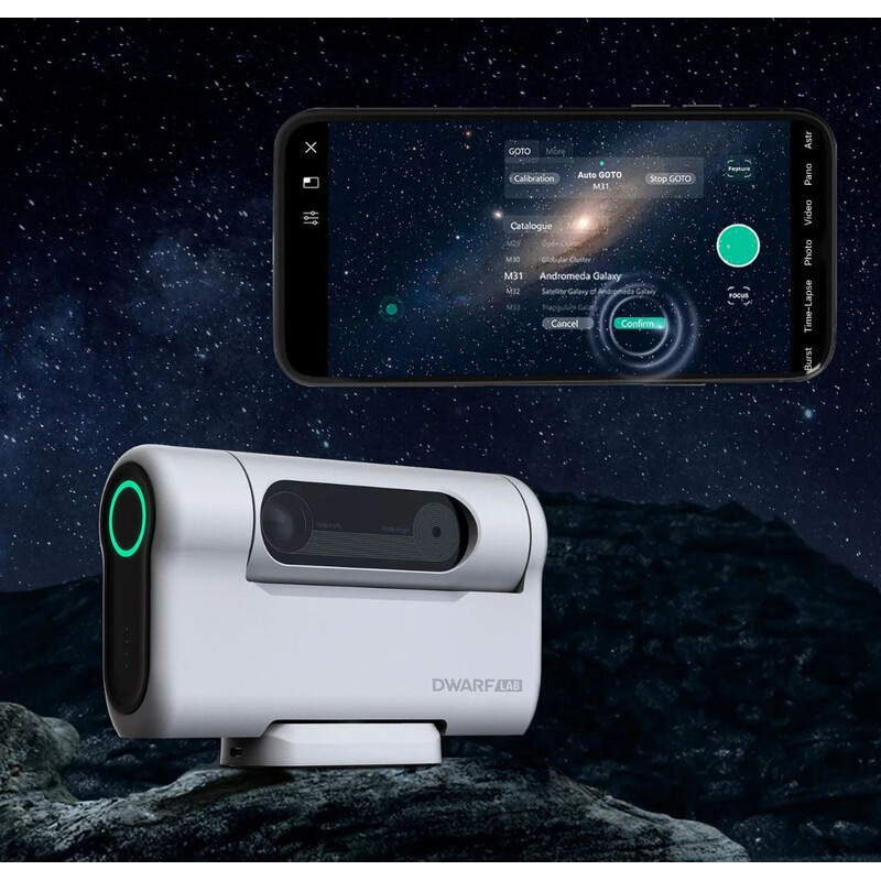 DWARF II es un telescopio inteligente portátil con doble cámara. ¡Funciona tanto de noche como de día! Con él podrá tomar fotografías astronómicas de la Luna, el Sol y los objetos del cielo profundo, así como capturar la naturaleza, observar, filmar y fotografiar aves y otros animales.