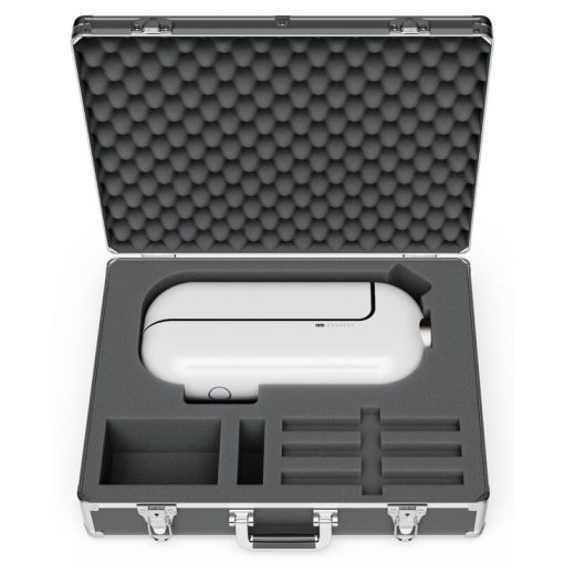El volumen de suministro incluye además un trípode ajustable con nivel de burbuja integrado, un conector USB-C y una tapa para el objetivo.